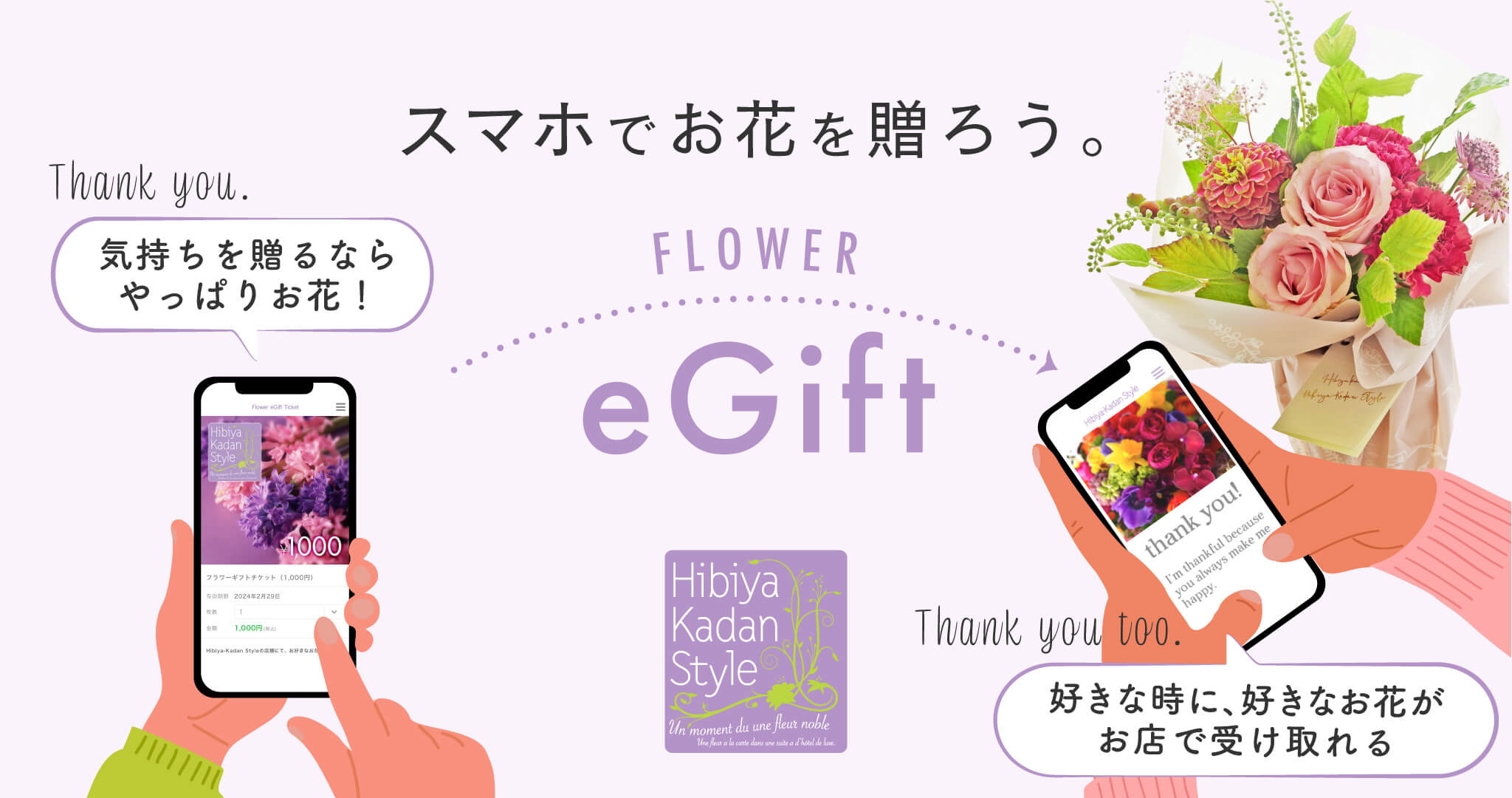 日比谷花壇のFlower eGift は 感謝やお祝いの気持ちにeギフトチケットを添えて LINEやメールなどで気軽に贈ることができるサービスです。
